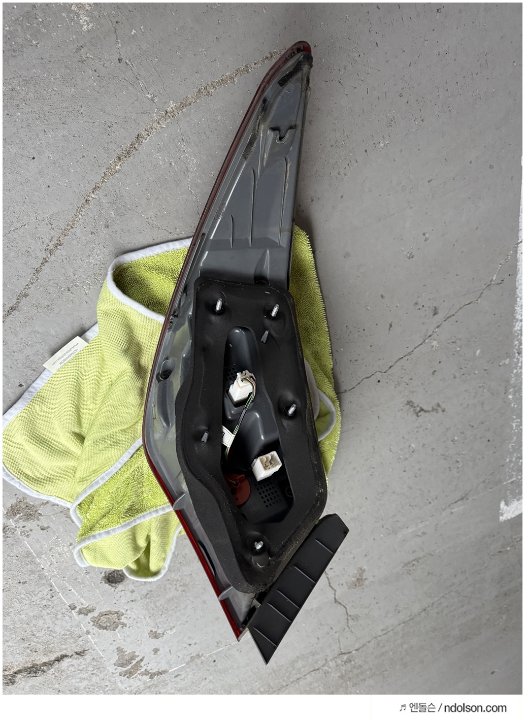 차에 꽂기 전 12V 어댑터로 테스트를 해봅니다. 영롱하게 들어오는 면발광 라인을 보면 희열이 느껴지실 거예요! 확인이 끝나면 절개했던 플라스틱을 덮고 실리콘으로 완벽하게 방수 처리를 해줍니다. 물이 들어가면 기판 전체가 쇼트 나기 때문에 가장 꼼꼼히 해야 하는 단계입니다.