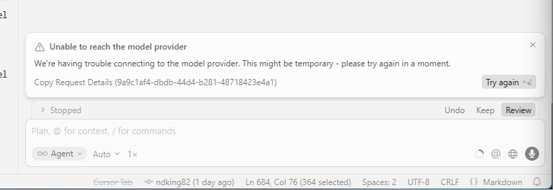 이 상황에서는 Cursor 자체 문제가 아니라 모델 공급자(OpenAI, Anthropic)와의 연결이 중간에서 끊기며 요청이 강제로 종료된다.
